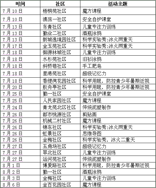 ????这个夏天最火热的是什么?那肯定是第十一届社区邻里节“青少年社区成长夏令营”了!为了丰富暑期生活,在两个月的暑期里,发挥社区学校的作用,让青少年学生结识邻里、回归社区,从活动中,培养团队协作的意识,发扬友爱互助的精神,养成讲文明、懂礼貌的好习惯,让青少年们真正度过一个健康、愉快、有意义的暑期。常州社区网联合常州公益联合助学会、江苏城乡建设职业学院等单位,在社区开展13大类的各项青少年的暑期活动。截止目前,各社区报名火热,活动课程已达近50场。
