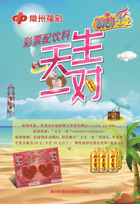 ??? 四、活动规则:促销活动期间,彩民购买“天生一对”刮刮乐,单张票中奖金额为10元(不含10元以上),即奖励彩民指定饮料(加多宝)一听。